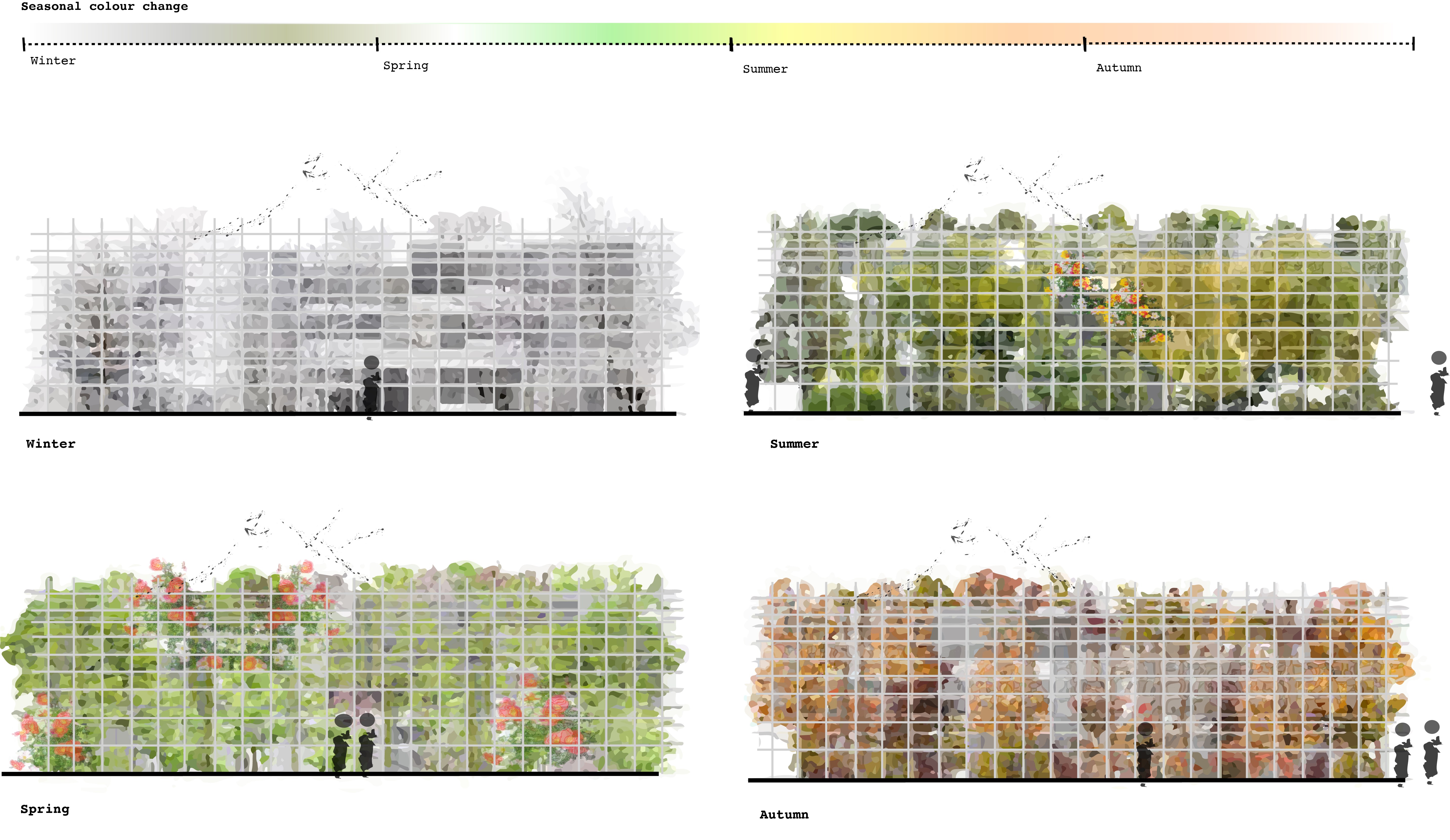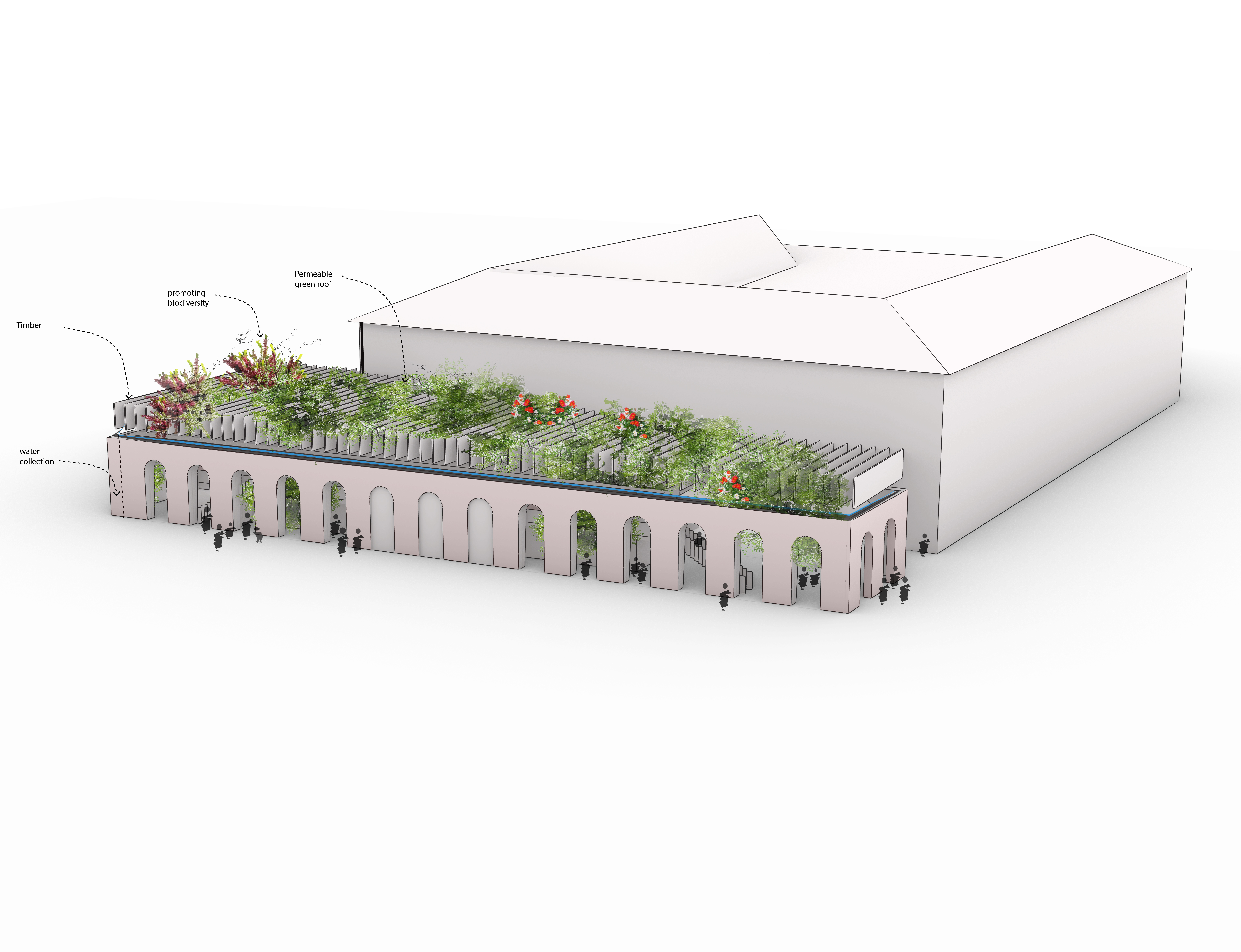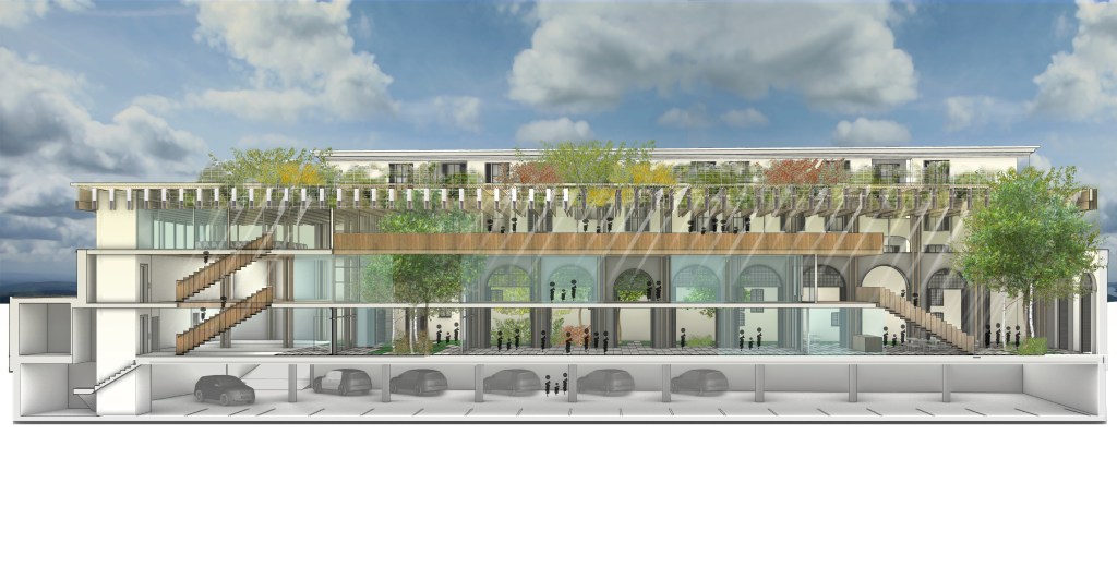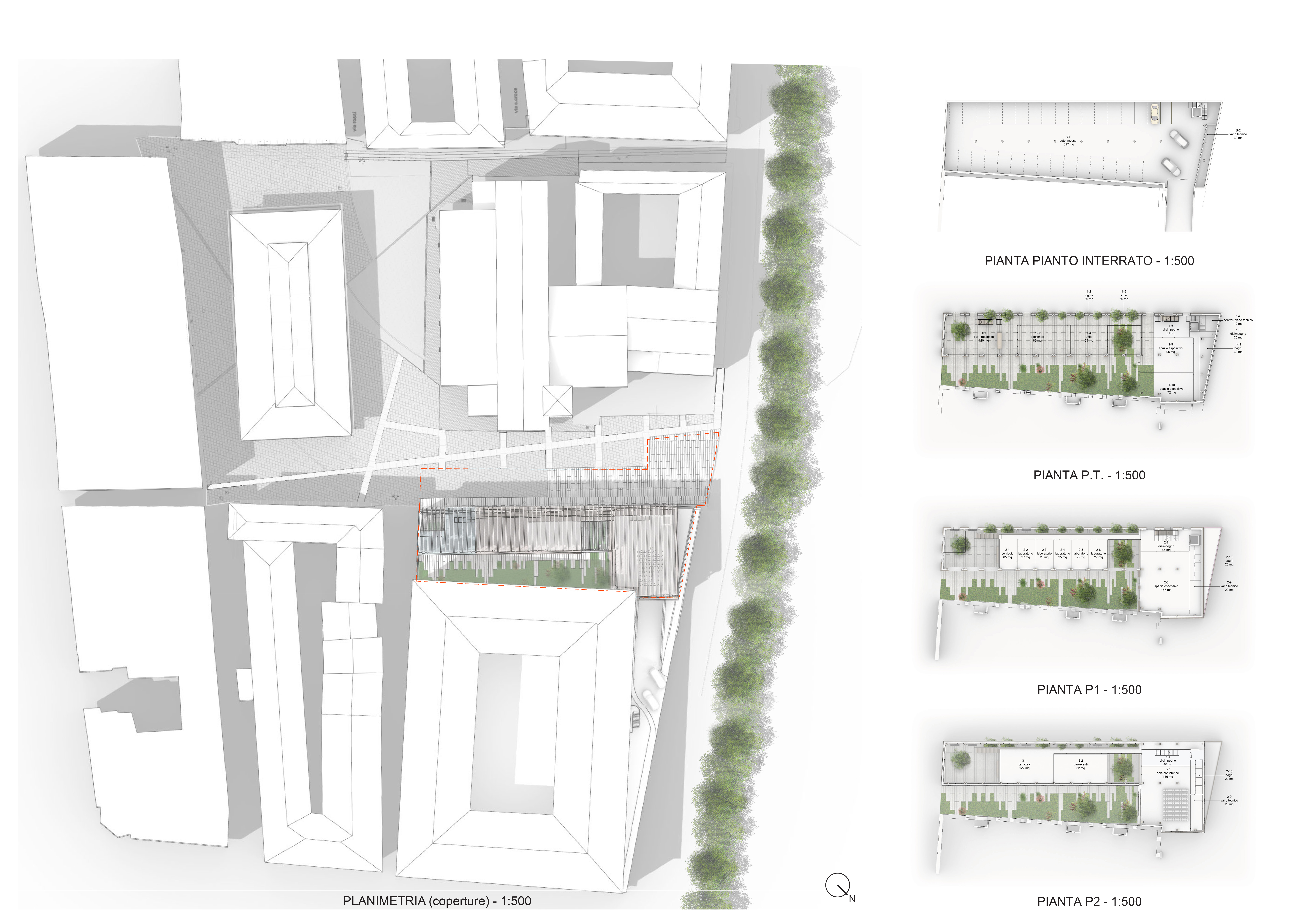 Ispirato dalla visione di una ‘città sostenibile’, dove la natura è completamente integrata con il contesto urbano, il progetto si è concentrato sulla progettazione di uno spazio pubblico con un tetto verde permeabile, sospeso sopra il volume dell’edificio integrando varie attività immerse nella vegetazione. Un tetto che cambia colore nel corso delle stagioni, le foglie delle piante che cambiano colore dalla primavera all’estate, dal verde al giallo, un edificio che vive e si adatta ai cambiamenti stagionali. Un progetto con attività versatili , multi programmatiche immerse nel verde, nel centro Storico di Cuneo. Il progetto offre un piano strada pubblico aperto, con una grande sala centrale con caffè, un cortile verde pubblico per spazio cinema , una sala conferenze e un giardino “pergola” verde aperto al pubblico. Un edificio in cui i visitatori si sentirebbero collegati alle strade alberate della città godendosi la vista, luce e privacy, un luogo dove connettersi per promuovere attività sociali e cultura. Tecnicamente efficiente, la progettazione del verde integrato ha diverse funzioni tecniche, sia bioclimatiche, garantendo il comfort termico utilizzando le risorse ambientali, sia il riutilizzo e il riciclo dell’acqua piovana. Il progetto promuove un modo unico di vivere in città, con la sua combinazione di materiali e textures naturali integrati e soluzioni tecniche tutte progettate per maturare nel tempo: man mano che la vegetazione cresce, l’edificio cambia e le sue caratteristiche si evolvono.